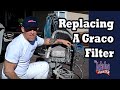 Cleaning and repairing airless paint sprayers. How to remove a filter on a Graco 695 Airless sprayer for cleaning. Removing and re-installing the filter. Issues that may arise if the filter on the airless sprayer is not cleaned regularly.